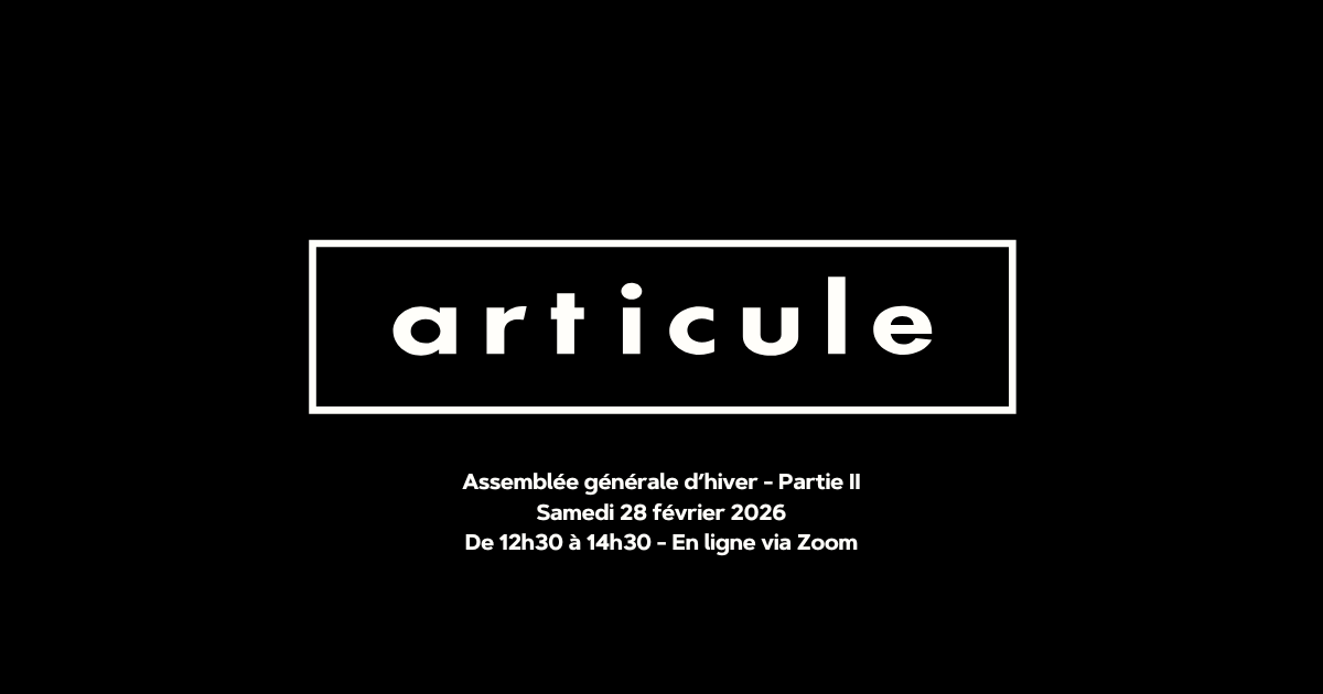 Nous complèterons avec une mise à jour importante de nos plans d'immobilisation et des options disponibles pour notre centre. Rejoignez-nous afin de décider, en collectivité, quels sont les plans de déménagement d'articule et quelle option convient le mieux à notre membrariat. Nous sommes également ravi·e·s de vous présenter les artistes et collectifs invités à participer à notre programmation printanière et à nos événements discursifs.