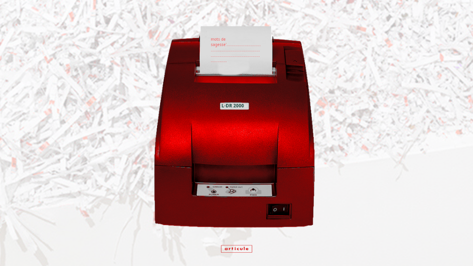 Prenant la forme d’une imprimante thermique (Epson Tm-U220), le modèle crache des « mots sages » et des métaphores absurdes puisés de l’internet par une IA. Lors de ce lancement, le public aura l’occasion de récupérer leur propre dicton individuel généré sur place. Dominic Lafontaine fera aussi la promotion de son dernier prototype, le CZNT-1000.
